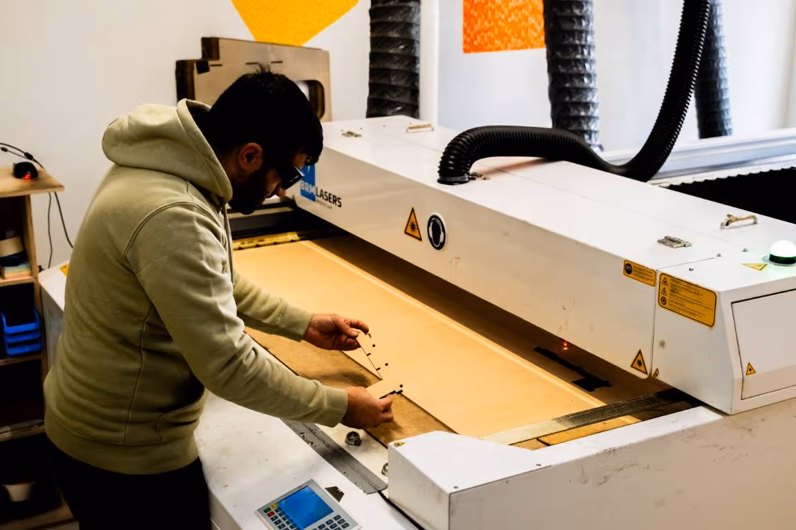 To achieve that high level of customization, Outbase Campervans uses a BRM laser machine.“Our entire interior — everything made of wood — is cut to size with the BRM lasermachine. For us, it’s an essential part of production,” Tim explains. The laser’s precision and efficiency ensure a clean final result and less material waste. “Using the machine creates a better working environment, reduces strain and energy use, and minimizes waste. You can place the cutting lines much closer together than with a CNC machine.”